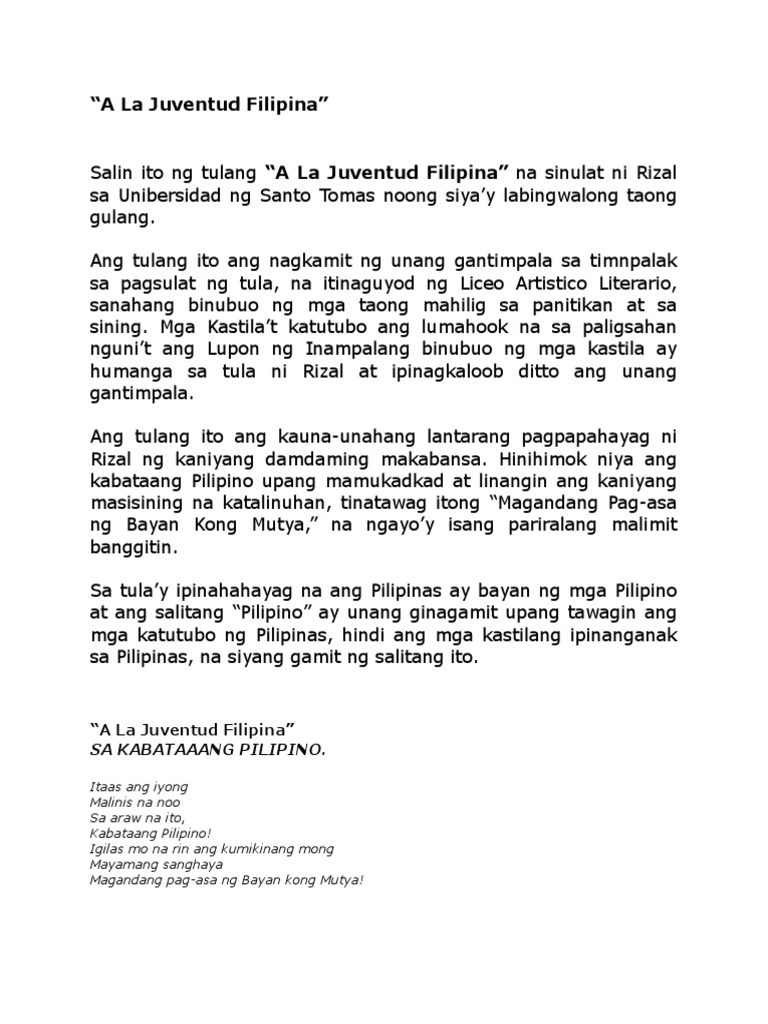 Sa kabataang Pilipino Salin ito ng tulang A La Juventud Filipina na sinulat ni Rizal sa Unibersidad ng Santo Tomas noong siyay labingwalong taong gulang. Magandang pag-asa ng Bayan kong Mutya. Libreng edukasyon ang ipinamulat saatin sa henerasyon ngayon dapat lang natin pahalagahan at alagaanwalang anuman ang makakahigit sa edukasyon hindi lamang saakin kundi na rin sa kabataang binigyan ng pagkakataon para ipagpatuloy ang kanilang sinimulanedukasyon isang salita bagamat mayroong ibang kabataan ang hindi nag aaral dahil sa kakulangan na din sa baon at.