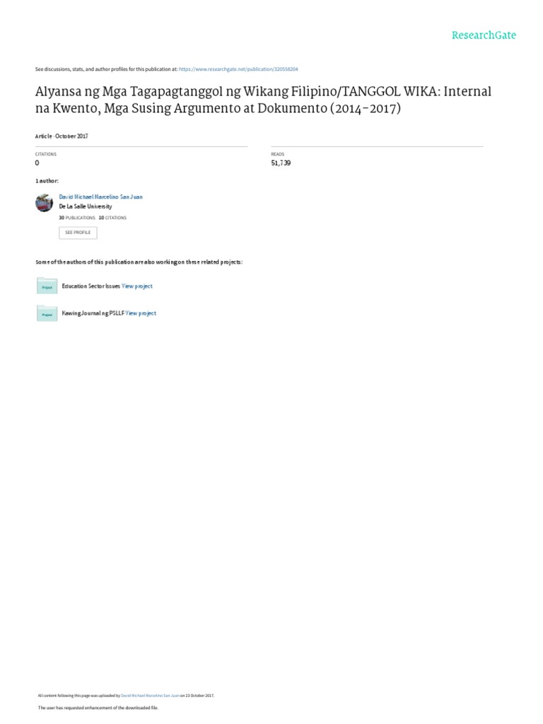Ang Wika at Panitikang Filipino sa Kurikulum ng Kolehiyo 1996-2014 David Michael M. San Juan David Michael M. 12 STEM B Ibat ibang Anyo ng Sulating Akademiko ABSTRAK Kahulugan.